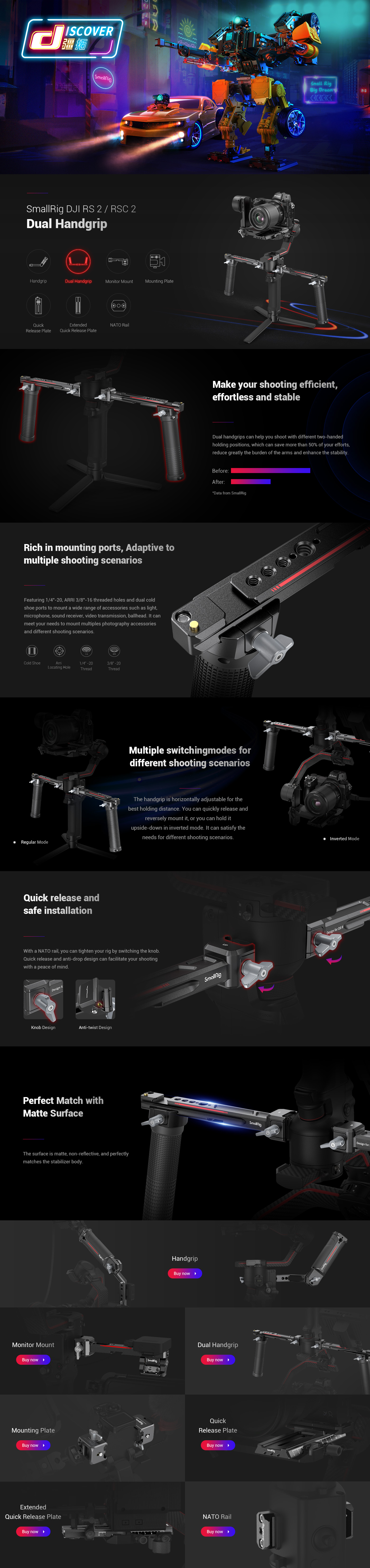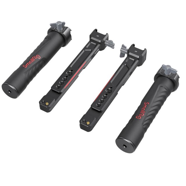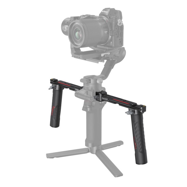 A SmallRig Dual Handgrip for DJI RS 2 / RSC 2 / RS 3 / RS 3 Pro / RS 4 / RS 4 Pro 3027 úgy tervezték, hogy csökkentse a kar fáradtságát a forgatás során, és gazdag tartozéktartozék rögzítést biztosítson. A gimbal mindkét oldalán lévő NATO sínhez rögzíthető, könnyen levehető és időtakarékos. A markolat kétoldali NATO-sínnel van kialakítva, amely nem csak vízszintesen állítható, hanem könnyen levehető és támogatja a fordított módban történő fényképezést. A beépített több 1/4"-20 és ARRI 3/8"-16-os menetes furatokkal a Magic Arm 2115 rögzíthető a monitorhoz. A hidegcipő-nyílások használhatók a Monitor Mount 2905, vezeték nélküli go, mikrofon, hangvevő stb. számára. Négy részre szétszerelhető a könnyű tárolás és szállítás érdekében.
