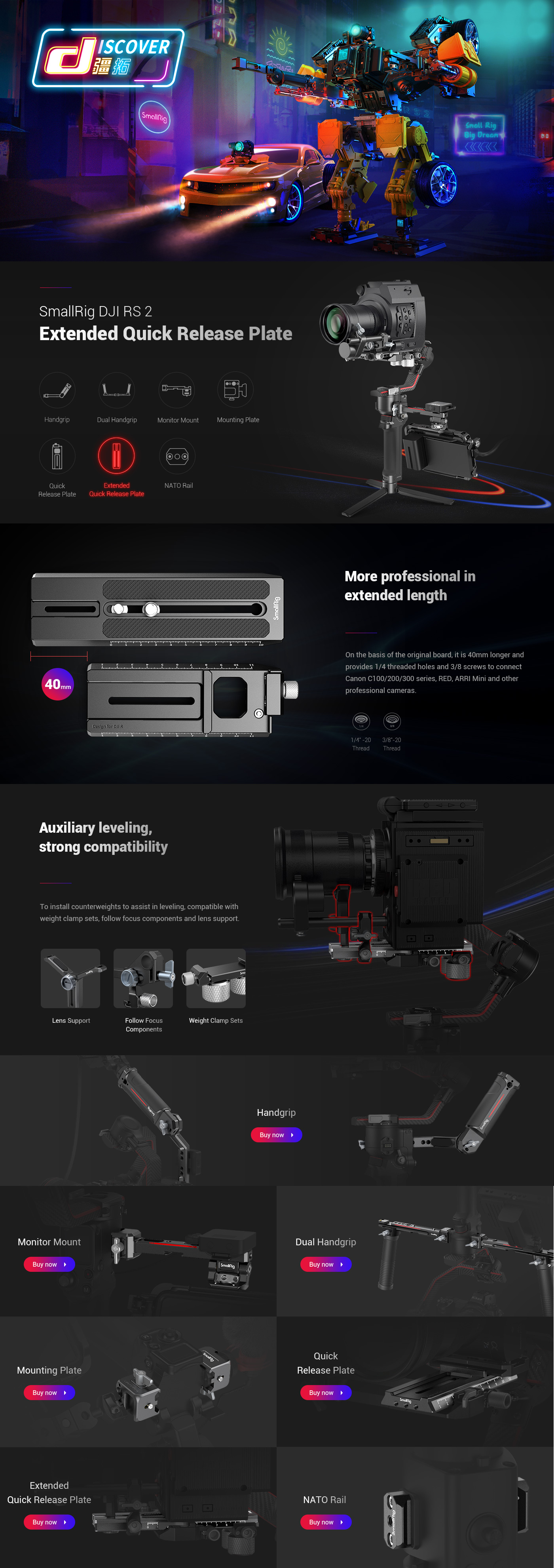 A SmallRig Extended Quick Release Plate for DJI RS 2 / Ronin-S / RS 3 / RS 3 Pro 3031B a professzionális kamerák, mint a Canon C100/200/300, RED és Komodo gimbalra történő rögzítéséhez készült. A meghosszabbított lemez 40mm-t ad hozzá a lemezhez az eredeti kamera lemezhez képest.