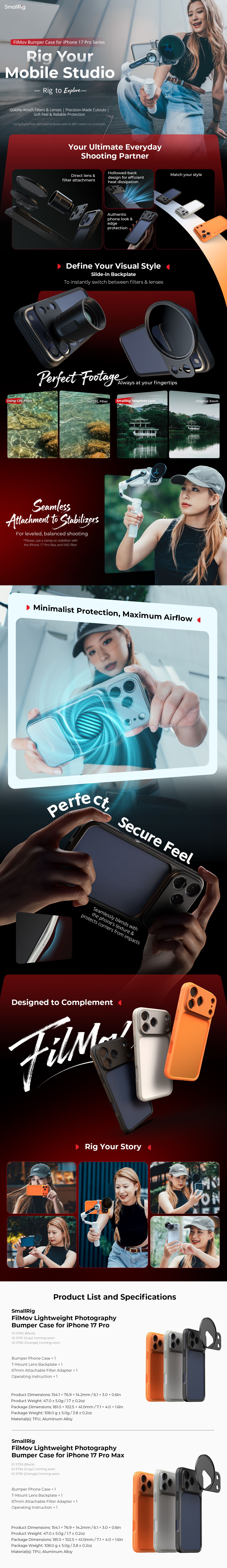 Gyorsan leszerelhető lencse hátlap rendszerrel rendelkezik, amely T-Mount lencse hátlapokat és 67 mm-es csatlakoztatható szűrőadaptereket tartalmaz a lencsék és mágneses szűrők gyors cseréjéhez. A tok puha TPU anyagból készült, kényelmes fogást biztosít, miközben alapvető védelmet nyújt a telefon sarkainak és éleinek.