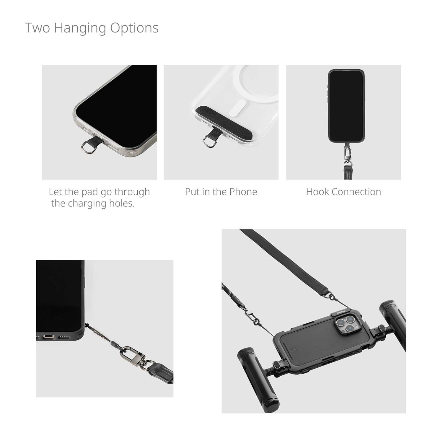 A csomag két nyakláncot és egy kötélpárnát tartalmaz a telefontokokhoz való egyszerű rögzítéshez, kompatibilis minden teljes testre szerelhető vagy nyakláncnyílással ellátott tokkal. Két felakasztási lehetőség áll rendelkezésre: 1) A kampót vagy a kötelet a tether padhoz rögzítheti, miután a padot behelyezte a töltőport nyílásába, és a telefont a tokhoz rögzítette. Az ultravékony párna nem akadályozza a csatlakozós töltést. 2) Csatlakoztassa a kötelet közvetlenül a tokhoz a kötéllyuk segítségével. Ezen kívül két nyakláncot is használhatsz a telefontokok felakasztásához, így még több sokoldalúságot kínálsz.