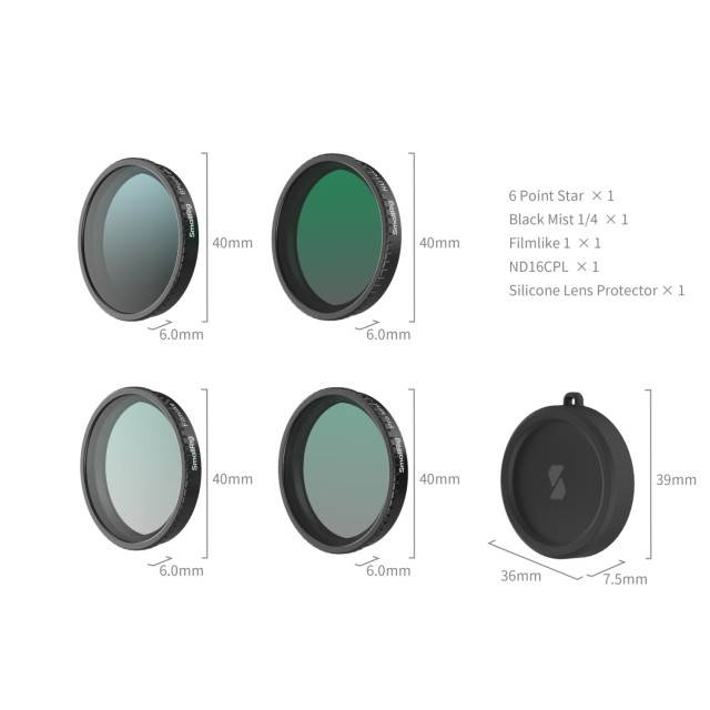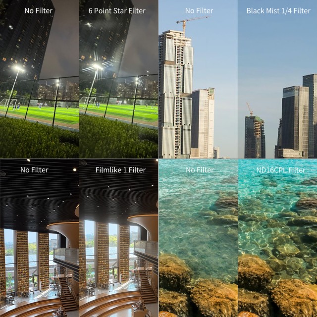 Ez a készlet tartalmaz egy 1/4 fekete ködszűrőt, egy ND16 és CPL szűrőt, egy filmszimulációs szűrőt, egy csillagkereszt szűrőt és egy szilikon lencsevédőt. Az 1/4 fekete ködszűrő lágyítja a fényeket az álomszerű, filmszerű hatás érdekében. Az ND16 & CPL szűrő kiküszöböli a tükröződéseket, miközben biztosítja a színhű színvisszaadást, így ideális tájképek és építészeti fotózáshoz fényes körülmények között. A filmszimulációs szűrő analóg filmtónusokat hoz létre, tökéletes portrékhoz, utcai fotózáshoz és vintage stílusú képekhez. A csillagkereszt szűrő a pontszerű fényforrásokat éjszakai jeleneteknél drámai 6 pontos csillaghullámokká alakítja át. A további kényelem és védelem érdekében a készlet tartalmaz egy puha szilikon lencsevédőt, amely használaton kívül megvédi a fényképezőgép objektívjét a karcolásoktól és a portól.