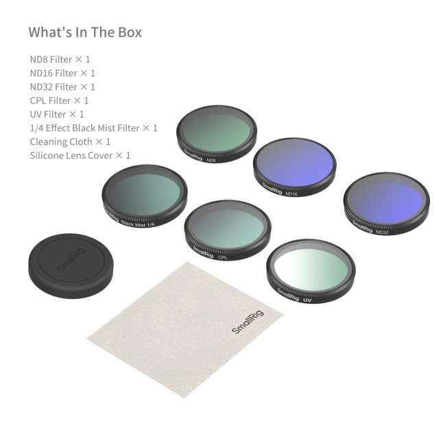 A csomag tartalma: ND8 szűrő, ND16 szűrő, ND32 szűrő, CPL szűrő, UV szűrő, 1/4 hatású fekete ködszűrő, szilikon lencsefedél és tisztító kendő. Az ND szűrőkészlet ideális fénycsökkentést biztosít különböző környezetekben, miközben élénk színekkel gazdagítja a felvételeket. A CPL szűrő hatékonyan megszünteti a nem fémes felületekről, például vízről és üvegről visszaverődő nem kívánt tükröződéseket, miközben javítja a víz alatti és az ablakon át láthatóságot. Az UV szűrő megvédi a lencsét a karcolásoktól és az ütésektől, míg a 1/4-es fekete ködszűrő lágyítja a fényeket, álomszerű, filmszerű hatást kölcsönözve a felvételeknek. A gyors rögzítésű kialakítás lehetővé teszi a közvetlen felszerelést anélkül, hogy le kellene venni a lencsét, ami jelentősen javítja a felvételek hatékonyságát.