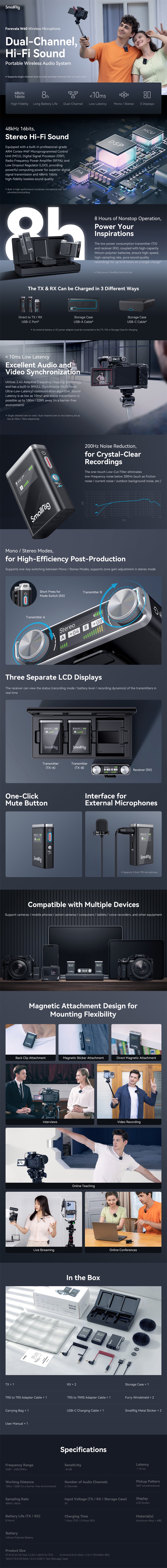 A termék masszív és intelligens, és RX és TX nagy kapacitású Li-polimer akkumulátorral van felszerelve, amely akár 8 órás üzemidőt tesz lehetővé egyetlen feltöltéssel. A stabil vezeték nélküli hangátvitel 100 méteres maximális jeltávolsággal büszkélkedhet (akadályok nélkül); a mono és sztereó, sztereó felvétel és hangvisszaadás közötti váltás javítja az utólagos szerkeszthetőséget; a TX-A és TX-B bemeneti és kimeneti hangereje fel van osztva és függetlenül állítható; a 200 Hz alatti alacsony frekvenciájú zaj kiküszöbölhető a tisztább hangkimenet érdekében. Plug and play és intelligens párosítással rendelkezik, így széles körben használható kültéri élő közvetítésben, mukbang, interjúfelvétel, videofelvétel és online tanítás során, professzionális hangélményt nyújtva a felhasználóknak.