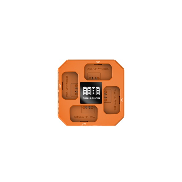 A négy dedikált csatorna lehetővé teszi négy NP-FW50 akkumulátor egyidejű töltését, hatékony gyors töltést biztosítva a szigorú forgatási ütemterveknek való megfeleléshez.