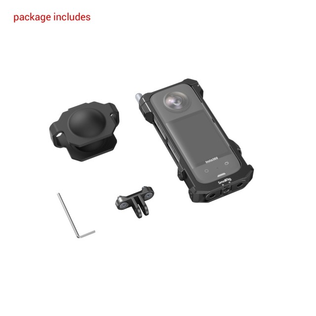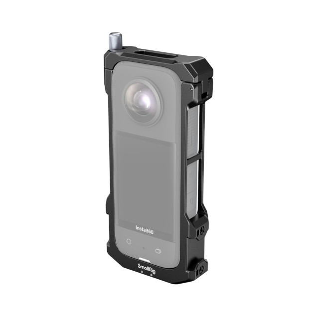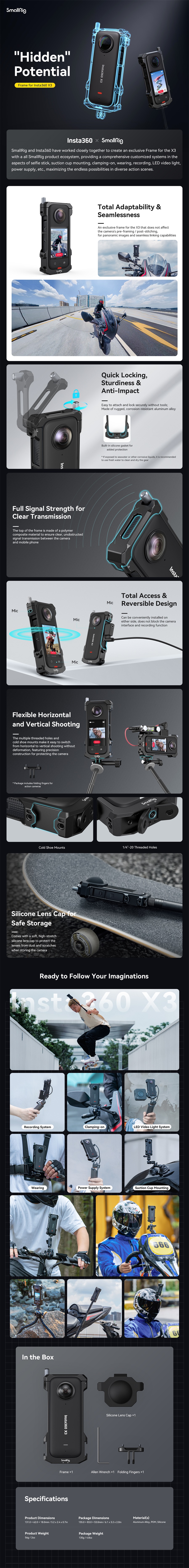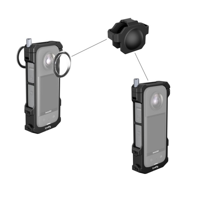 A SmallRig Frame for Insta360 X3 4088B védi a kamerát, és megkönnyíti a fényképezést, mivel változatos kiegészítő rögzítési lehetőségeket biztosít. A formás keret szilikon párnákkal rendelkezik, amelyek megakadályozzák a karcolásokat, és egy marokcsavar segítségével biztonságosan rögzíti a kamerát, amelyet a keret tetejéről helyezünk bele. Mindkét oldalon két vakusín található pl. mikrofon és/vagy kameralámpa számára. A mellékelt összecsukható "ujjak" mindkét oldalra felszerelhetők a szelfibotok, alaplapok stb. rögzítéséhez. Az integrált összecsukható ujjak alján egy 1/4"-20-as menetes furat található állványhoz. Emellett egy lencsesapka is jár hozzá a karcolások megelőzésére.