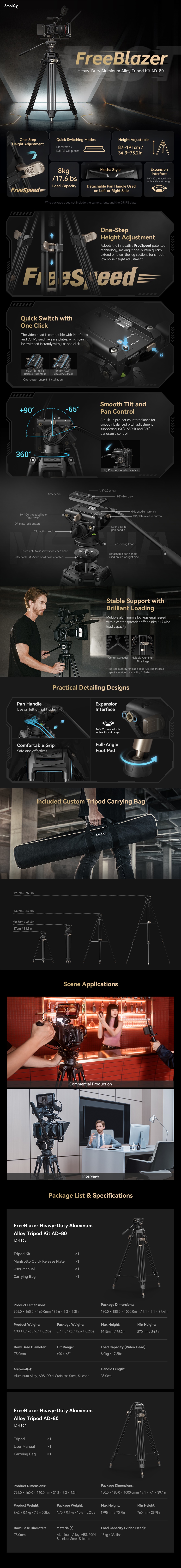 A SmallRig FreeBlazer Heavy-Duty alumínium ötvözetből készült állványkészlet AD-80 4163, egy videós állványkészlet, amely megkönnyíti a videofelvételt. Az állvány állítható lábakkal rendelkezik, amelyek gyorsan behúzhatóak és kihúzhatóak a pattintható zárak segítségével, 87 cm és 191 cm közötti magassággal és 90,5 cm-es összecsukott hosszal. A csillapító rendszerrel ellátott videós fej lehetővé teszi a kamera zökkenőmentes pásztázását. Ha a súlypontja magasságát 55 mm-re helyezzük, a pásztázás, és az előre beállított ellensúlyozó rendszer segít pontosan irányítani a kamerát vagy más, akár 3 kg súlyú rigeket a nagyszerű dinamikus egyensúly érdekében.
