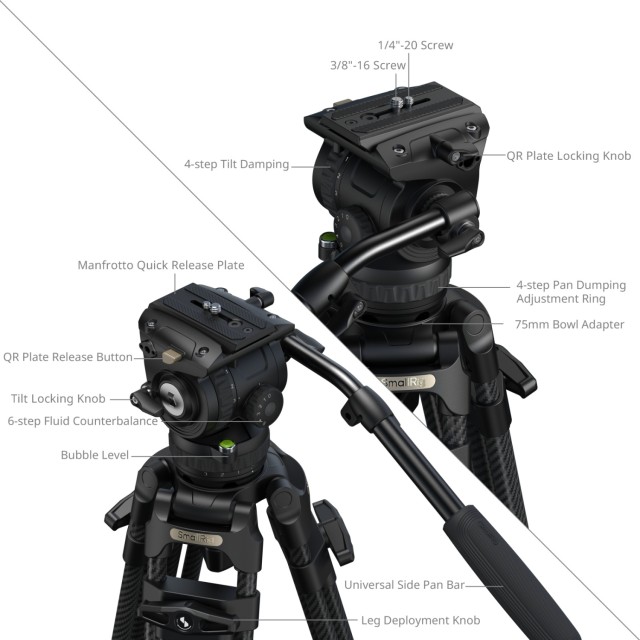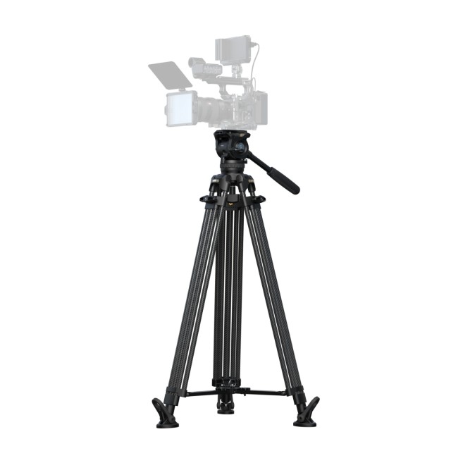 A háromrészes, 2-2-1 szegmensű, 16 mm átmérőjű szénszálas lábakkal és szabványos 75 mm-es tálcával ellátott állványhoz egy 6 fokozatú ellensúlyos és független, 4 fokozatú dőlés-/forgáscsillapító vezérlésű folyadékfej tartozik. Az ellensúlymechanizmus 0 kg és 6 kg közötti terhelést támogat, míg a fej biztonságos üzemi súlya 10 kg, maximális terhelhetősége pedig 15 kg. Az állvány munkamagassága 93,6 cm és 214 cm (36,9 hüvelyk és 84,3 hüvelyk) között változik, biztosítva a nagy terhelésű stabilitást és a sima mozgást a magas szögű felvételekhez.