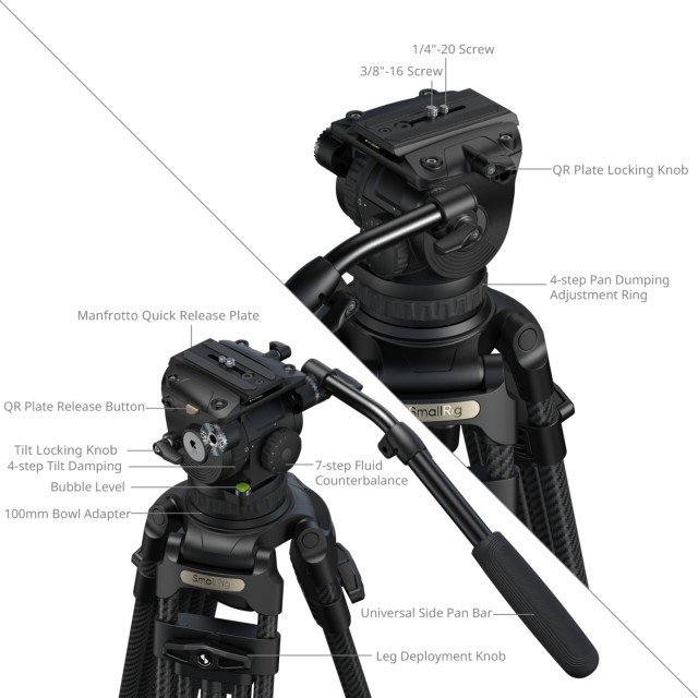 A háromrészes, 2-2-1 szegmensű, Ø18 mm-es szénszálas lábakkal és standard 100 mm-es tálcával ellátott állványhoz egy 7 fokozatú ellensúlyos és független 4 fokozatú dőlés-/forgáscsillapítás-vezérléssel rendelkező folyadékfej tartozik. Az ellensúlymechanizmus 4 kg-tól 10 kg-ig (8,8 lb-tól 22 lb-ig) terhelhető, míg a fej biztonságos üzemi súlya 15 kg (33,1 lb), maximális terhelhetősége pedig 17 kg (37,5 lb). Az állvány munkamagassága 89,8 cm és 200,5 cm (35,4 hüvelyk és 78,9 hüvelyk) között változik, biztosítva a nagy terhelésű stabilitást és a sima mozgású felvételeket, miközben támogatja a magas szögű felvételi helyzeteket.