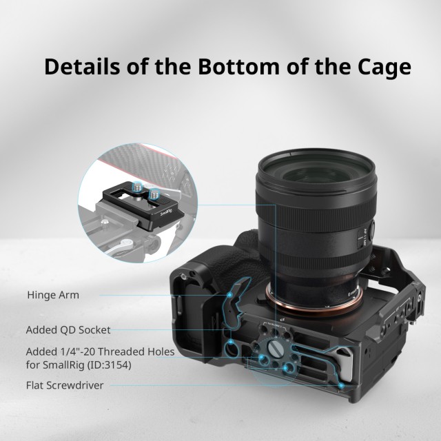 A SmallRig 3667B Full Cage a Sony Alpha 7 IV/Alpha 7 S III/Alpha 1 kamerákhoz tartozékok rögzítésére és a kamera védelmére szolgál. Két reteszelő oldallapot tartalmaz, valamint egy 1/4"-20-as csavart az alján, hogy pontosan rögzítse a fényképezőgépet és megakadályozza az elmozdulását. A beépített körkörös védőbetétek megakadályozzák a kamera karcolódását. A cage hozzáférést biztosít az interfészekhez, tárcsákhoz, gombokhoz vagy az akkumulátor ajtajához. Az akkumulátortartó rekesznél van egy orsókulcs, amely illeszkedik a kamera ívéhez, és helyet hagy a kisujjnak a kényelmes fogás érdekében. Az 1/4"-20-as menetes furatok, az ARRI 3/8"-16-os rögzítőfuratok és vakusaruk támogatják pl. a 2165-ös felső markolatot, a 2093-as oldalsó markolatot, a 2903-as monitortartót, mikrofonokat, LED lámpákat, monitorokat stb. Az alján lévő Arca gyorskioldó lemez kompatibilis a DJI RS 2/RSC 2 és a DJI RS 2/RSC 2 stabilizátorok gyorskioldó lemezével (pad) a stabilizátoros felvételekhez. Az opcionális 3000-es cikkszámú HDMI kábelrögzítő az Alpha 7 IV/Alpha 7S III kamerákkal működik az interfészek védelme és a stabil jelátvitel biztosítása érdekében forgatás közben. A cage oldalán és alján található lyukak lehetővé teszik olyan tartozékok rögzítését, mint a PAC2456-os kézi heveder és a PSC2428-as vállpánt. Emellett a cage beépített mágneskulccsal rendelkezik, amely megkönnyíti a szét- és összeszerelést.