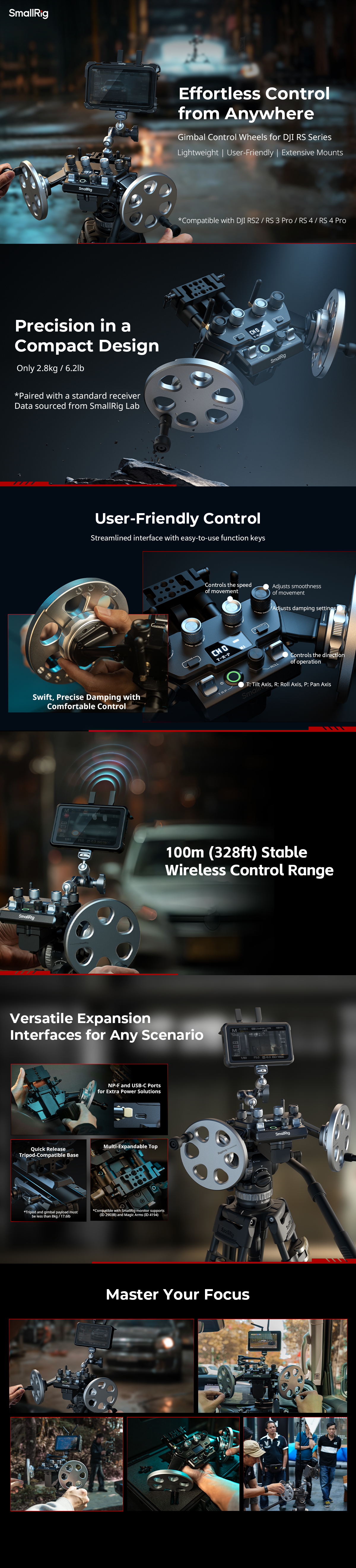 A SmallRig Gimbal Control Wheels for DJI RS Series 4525 a DJI RS2, RS3 Pro, RS4 és RS4 Pro stabilizátorok precíziós vezérlésének fokozására készült. A mindössze 2,76 kg-os súlyával hordozható és tökéletes az útközbeni felvételekhez. A vezérlőkerék egy felhasználóbarát panellel van felszerelve, amelyen a sebesség, a simaság és a csillapítás beállítására szolgáló gombok, valamint az irányvezérlő karok és a TRP tengely beállítása található.