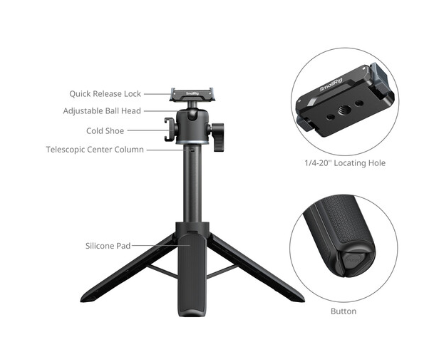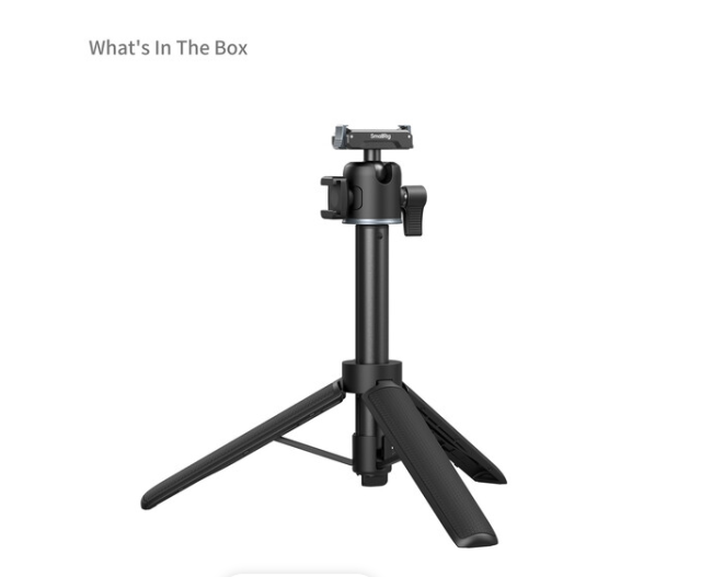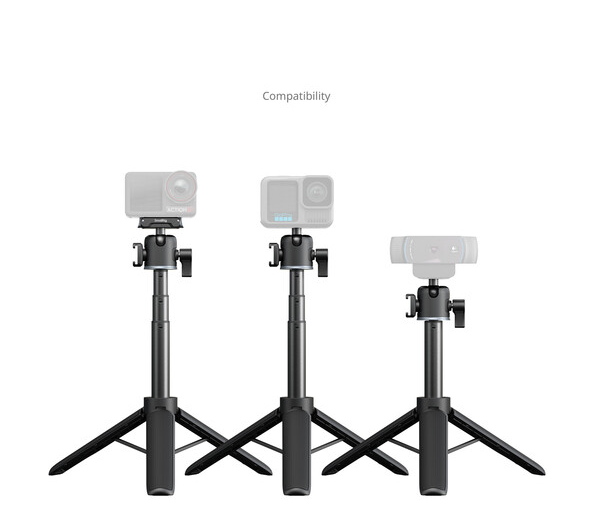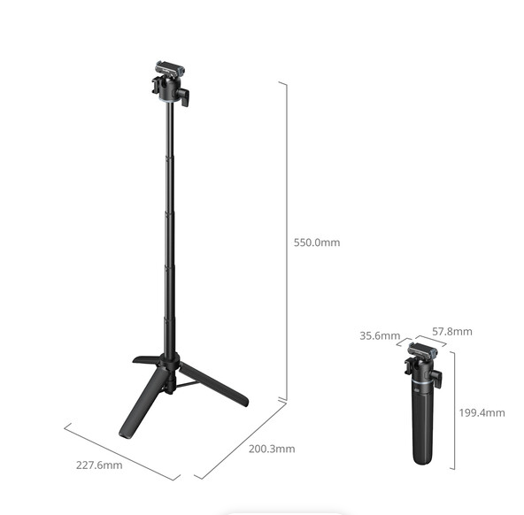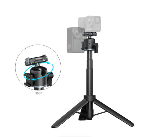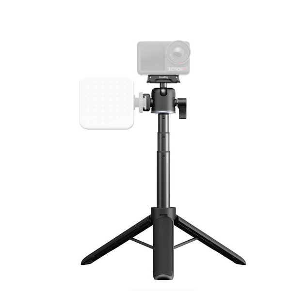 A SmallRig teleszkópos markolat/állvány segítségével kompakt akciókameráját sokoldalú kézi vagy állványra szerelhető eszközzé alakíthatja. A termék 4 részes alumínium rúddal rendelkezik, amely 7,9-21,7 hüvelykre nyújtható, összecsukható mini állványtalppal, állítható gömbfejjel 1/4"-20 csavarral és gyorskioldó akciókamerás bilincsel, amely akár 1,1 lb súlyú kamerát is képes megtartani – ideális a GoPro HERO és DJI Action sorozatokhoz (az Insta360 X sorozathoz nem ajánlott, mivel a rúd 360°-os módban látható).