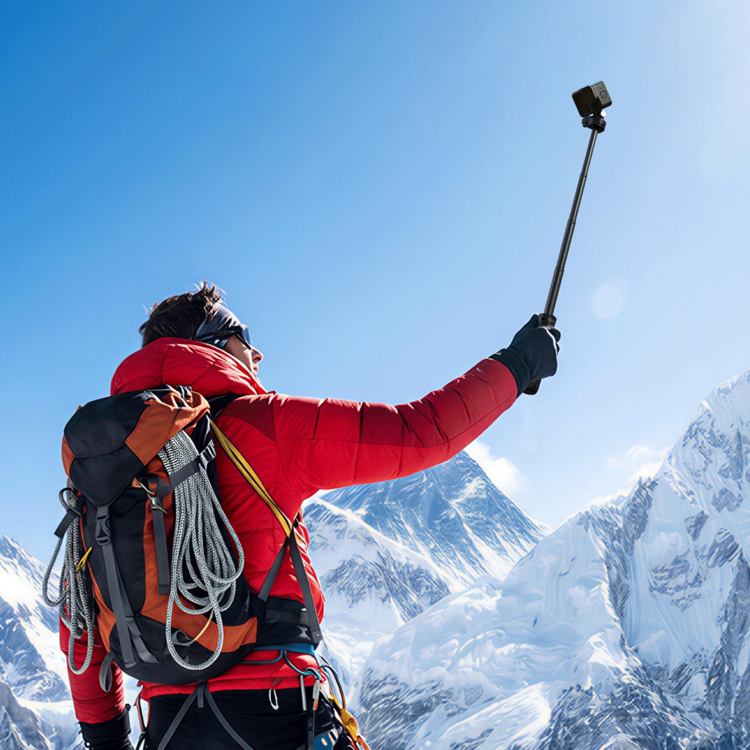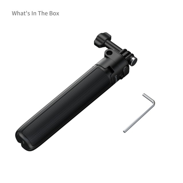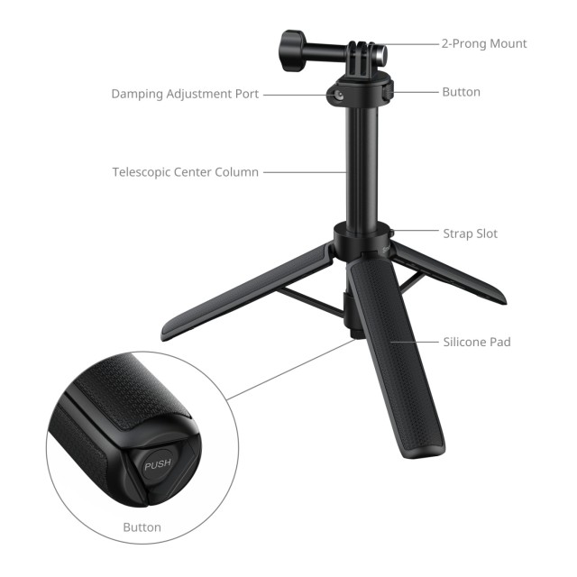 A hordozhatóság érdekében optimalizált, 4 részes teleszkópos rúdja 18 cm-re (7,1") összecsukható, így könnyen tárolható hátizsákban vagy zsebben, ugyanakkor 52 cm-re (20,5") is kinyújtható, így széles körű felvételi magassági követelményeknek felel meg.