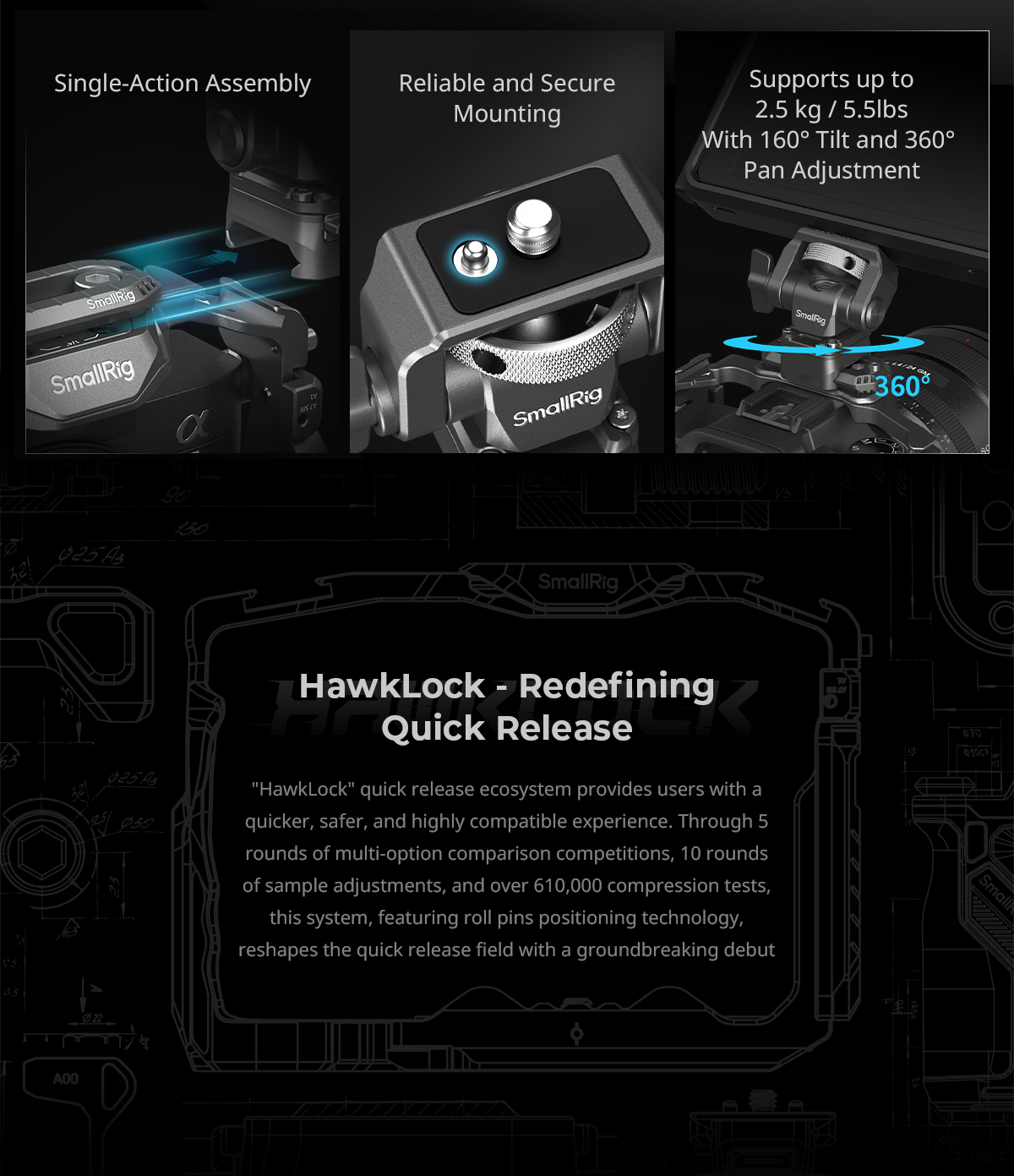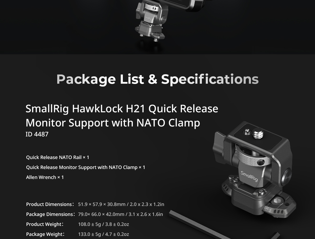 A SmallRig HawkLock H21 gyorskioldású monitor tartó NATO bilinccsel 4487 egy NATO bilinccsel ellátott gyorskioldású monitor tartóból és egy gyorskioldású NATO sínből áll. Nyomja meg a gombot a csapok kitágításához, és csúsztassa a NATO-sínt a horonyba. Engedje ki a gombot a NATO-sín biztonságos rögzítéséhez a monitortartóba, így a konstrukció stabil, a folyamat pedig időtakarékos. A tetején lévő 1/4"-20-as csavarral rögzíthető monitor, mikrofon, lámpa, vagy a beépített rugós rögzítőcsapnak köszönhetően Ninja V / Ninja V+ monitor a kitérés megakadályozása érdekében. Az elem támogatja a 160°-os dőlésbeállítást, és a dőléstengely feszessége gyorsan beállítható a gomb segítségével, hogy jobban alkalmazkodjon a különböző súlyú berendezésekhez. Az eszköz akár 2,5 kg / 5,5 fontot is elbír, és a csillapítás 10 000-szeres billentés után 20% alatt van, így tartós. 360°-os elfordítható beállítás a vízszintes tengely feszességének beállításával a mellékelt hatlapos kulccsal.