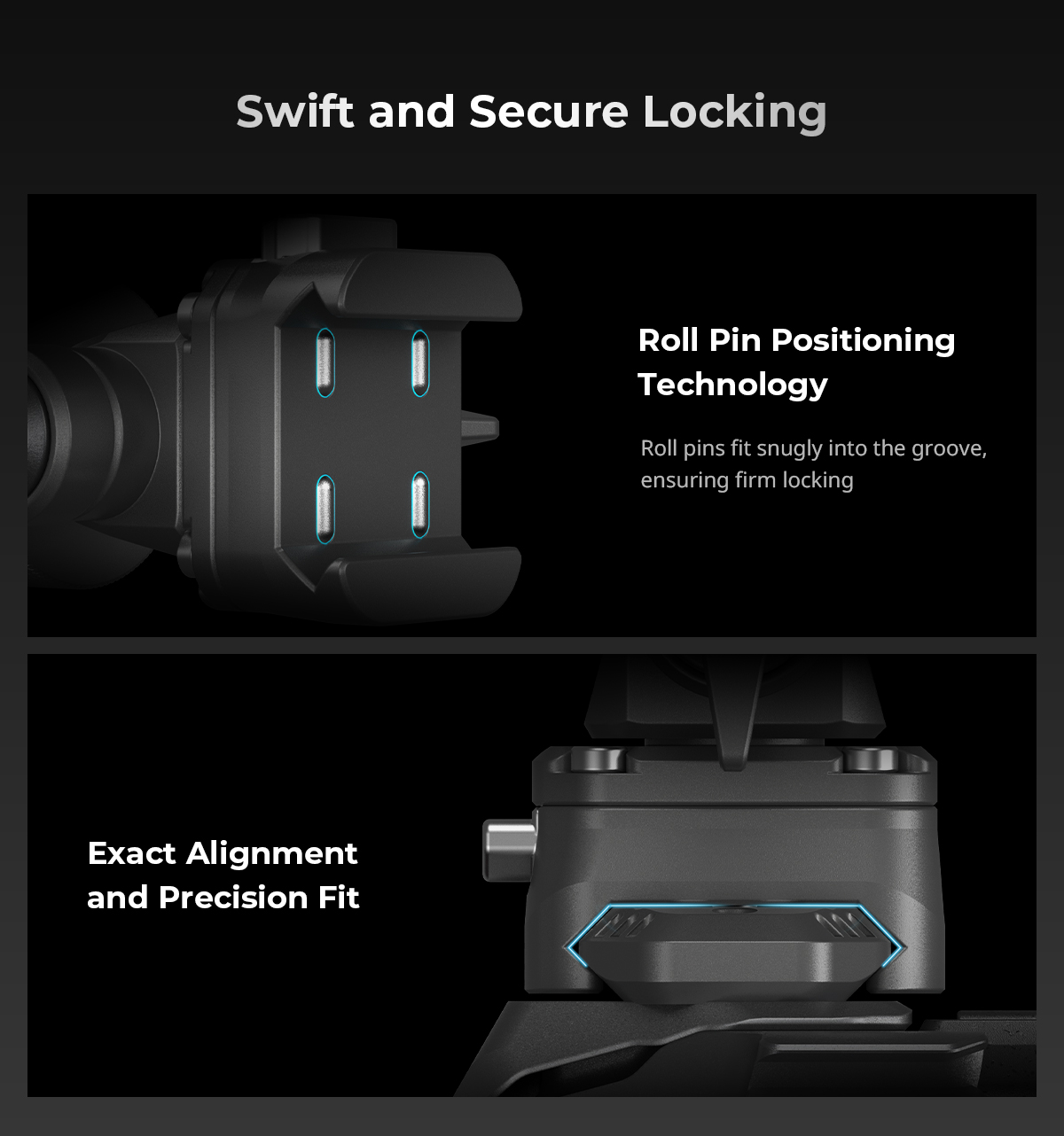 1. Exkluzív QR-Slide szabadalmaztatott szerkezet a NATO-fogóhoz, felfüggesztett csapokkal, amelyek a sínt a horonyba csúsztatás után rögzítik, így stabil és elhajlásmentes.