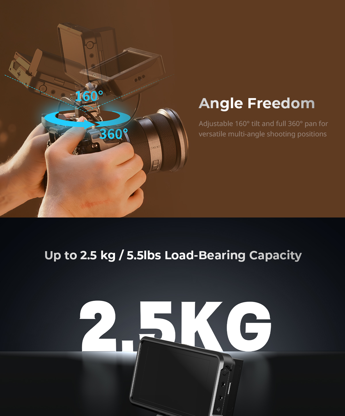 4. A készülék támogatja a 160°-os dőlést, a forgástengely szorosságának beállítását és a 360°-os elfordulást a többszögű kamera vagy monitor elhelyezéséhez.