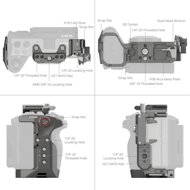A SmallRig HawkLock Quick Release Advanced Cage Kit for Sony FX3 / FX30 4771 a kamera védelmére és a tartozékok rögzítési pontjainak biztosítására szolgál, ezáltal javítva a forgatási élményt. Az XLR fogantyú meghosszabbítása ergonómiailag úgy lett kialakítva, hogy fokozza az eredeti XLR felső fogantyú fogását és erejét a tartozékok egyszerű bővítése érdekében. A dedikált HDMI kábelrögzítő védi az interfészeket a stabil jelátvitel biztosítása érdekében. A kézi pánt segít a stabilitás és a biztonság növelésében. A szabadalmaztatott, saját fejlesztésű gyorskioldó szerkezet (HawkLock néven) a hidegcipőt, a NATO-sínt és az Arca-Swiss lemezt takarja. A HawkLock öko-kiegészítőkkel, mint például a Magic Arm 4490, a Side Handle 4485, az Arca-Swiss Clamp 4486 stb. együtt használható a sima becsúszás és az önzárás elérése érdekében, hogy javítsa a szétszerelés és összeszerelés hatékonyságát. Ugyanakkor kompatibilis a hagyományos hidegcipővel, a NATO Clamp és az Arca-Swiss Clamp öko-kiegészítőkkel. Ezenkívül a ketrec beépített 1/4"-20-as menetes furatokkal, ARRI 3/8"-16-os helymeghatározó furattal, 1/4"-20-as helymeghatározó furatokkal, QD foglalattal és hevedernyílással rendelkezik, és olyan tartozékokkal bővíthető, mint a Magic Arm 3873, a Rod Clamp 3598, a QD vállpánt és a vállpánt PSC2428 a professzionális alkotáshoz. A könnyű összeszereléshez és szétszereléshez egy mágneses csavarkulcsot is mellékeltek.