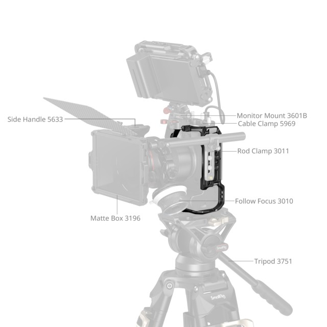 A tetején és mindkét oldalon található H21 NATO sín interfészek lehetővé teszik a felső fogantyúk (ID 5632, 5633, 4483, 4485, 3766), monitor tartókonzolok (ID 4487) vagy mágikus karok (ID 4489) gyors rögzítését. Több 1/4"-20 menetes furat és rögzítőfurat lehetővé teszi olyan kiegészítők felszerelését, mint az oldalsó fogantyúk (ID 2093, 4346), mágikus karok (ID 3874, 3875) és monitor tartókonzolok (ID 2904B). A jobb oldali markolat két vízszintes 1/4"-20 menetes furattal rendelkezik állványok (ID 3989) rögzítéséhez, ami növeli a stabilitást függőleges felvételek készítése során. A beépített hideg cipőfoglalat mikrofonok és kitöltő fények rögzítésére alkalmas, míg a csuklószíj-furat csuklószíjak (ID 3848, 2456) rögzítésére alkalmas. A speciális vállpánt furat úgy van kialakítva, hogy a kamera lencséje lefelé nézzen, amikor a táskát hordozzák, ami növeli a biztonságot. A QD aljzat QD gyorskioldó vállpántokkal (ID 4118) használható.