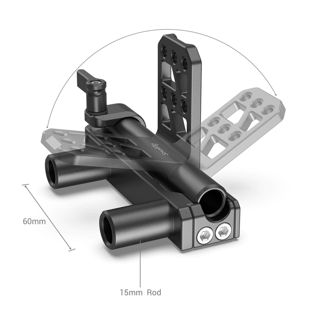 A SmallRig Dual 15 mm-es rúd akkumulátor csukló MD2802 az akkumulátor kényelmesebb rögzítésére szolgál. Szabványos kettős 15 mm-es rúddal rendelkezik, amely könnyen felszerelhető egy railblockra vagy egy kettős rúdrögzítővel ellátott vállpárnára, mint a VCT-14 Shoulder Plate 1954. Olyan akkumulátorlemezzel együtt kell használni, mint a V Mount Battery Plate 1846 és az MD2801 akkumulátorral együtt. A zsanér szöge állítható, és tetszés szerint rögzíthető a vállfára szerelt vállfán. Ezenkívül a zsanéron számos 1/4-20-as menetes furat található egyéb tartozékok rögzítéséhez.