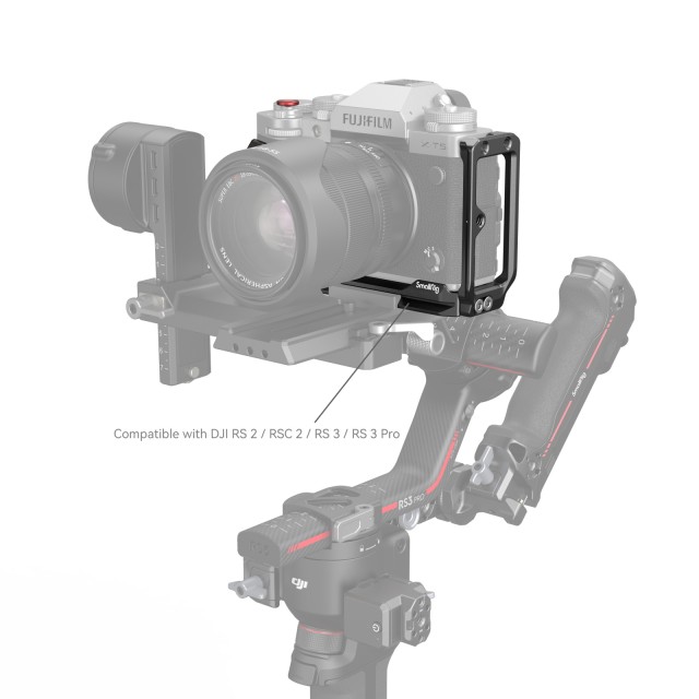 A SmallRig L-tartót a FUJIFILM X-T5 4137 kamerához úgy tervezték, hogy megkönnyítse a vízszintes és függőleges üzemmódok közötti váltást, és javítsa a fogás élményét. A fényképezőgépet egy 1/4"-20-as csavarral és egy rögzítőcsappal rögzíti az alján, a karcolásokat megakadályozó gumipárnákkal, és teljes hozzáférést biztosít a gombokhoz, a kártyafoglalatokhoz, az akkumulátorfedélhez és a flip képernyőhöz. A jobb fogásélményt biztosító beépített feketefa markolat mellett a lemez különböző tartozéktartókkal is rendelkezik. Az alján található egy Arca-Swiss gyorskioldó lemez Arca-Swiss állványokhoz és DJI RS 2 / RSC 2 / RS 3 / RS 3 Pro-hoz, 1/4"-20-as menetes furatok, valamint 3/8"-16-os menetes furatok, amelyek támogatják a Manfrotto 1280-as típusú tányért vagy a 2093-as oldalsó fogantyút a kézi függőleges felvételhez.