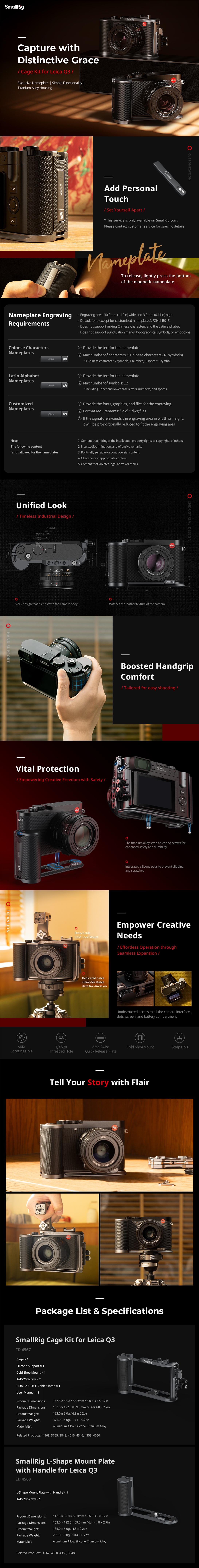 A SmallRig L-alakú rögzítőlemez fogantyúval Leica Q3 4568-hoz úgy tervezték, hogy javítsa a fényképezőgép fogásának élményét. Az L-Shape Mount Plate with Handle alulról egy 1/4"-20-as csavarral biztonságosan rögzíthető, és több beépített szilikonpárnával rendelkezik, hogy megakadályozza a fényképezőgép testének karcolódását. Ugyanazzal a textúrával és színösszeállítással rendelkezik, mint a fényképezőgép váza, így biztosítva a zökkenőmentes illeszkedést, miközben személyre szabott, gravírozott névtáblával személyre szabott hatást biztosít. A kulcsfontosságú teherbíró alkatrészek, például a kétoldalas szíjfuratok és a csavarok tartós titánötvözetből készültek.