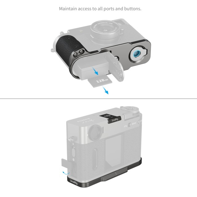 - Teljes hozzáférés az összes porthoz és kezelőszervhez, beleértve az akkumulátortartályt, a fókuszgyűrűt, a kártyahelyet és a hangszórónyílásokat.