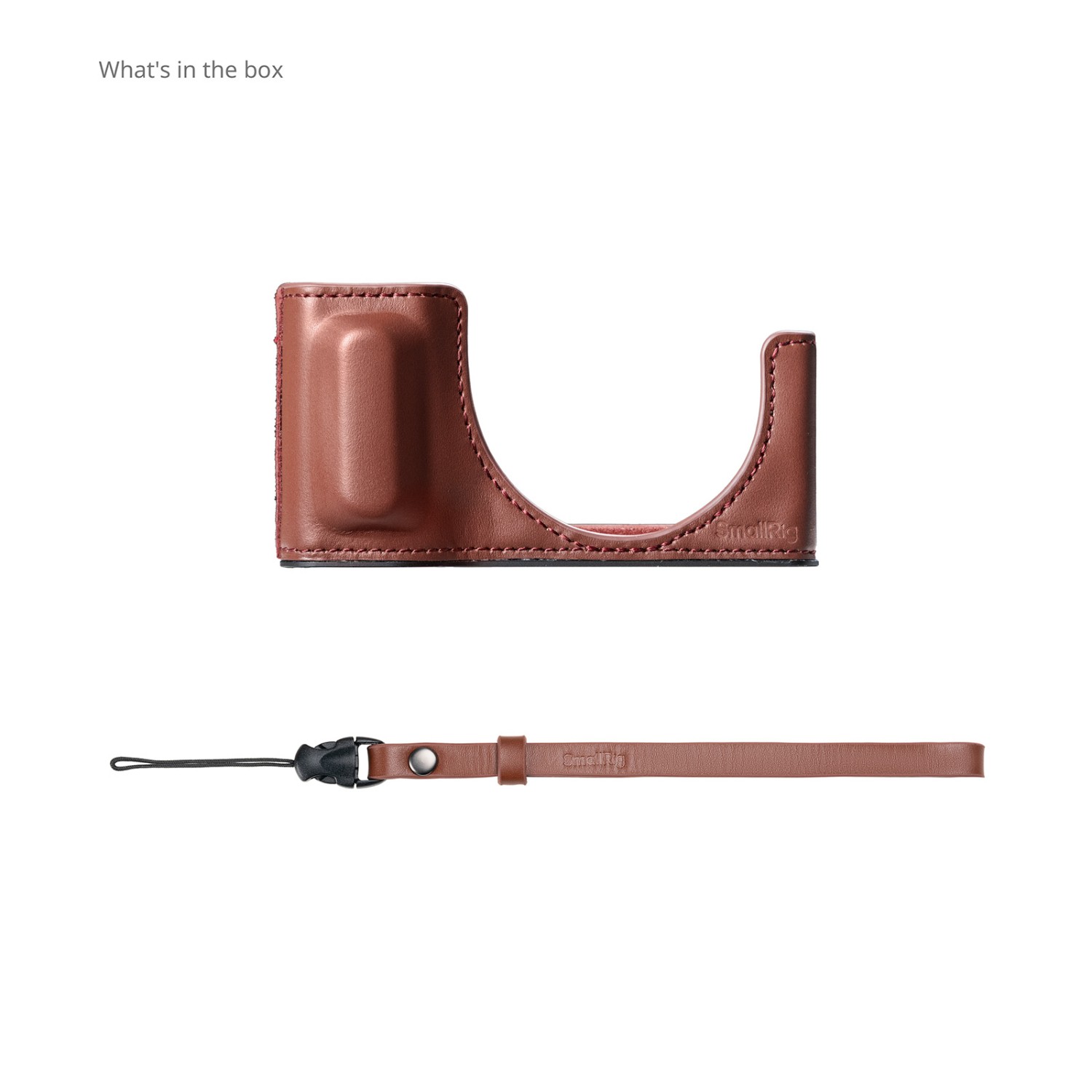 Prémium minőségű, első osztályú bőrből és precíziósan megmunkált alumíniumötvözet vázból készült tok szorosan körülveszi a kamera oldalait és alját, átfogó védelmet nyújtva, miközben biztosítja a portok, gombok és az akkumulátor rekesz akadálytalan hozzáférését. Kompatibilis az eredeti objektívfedéllel.