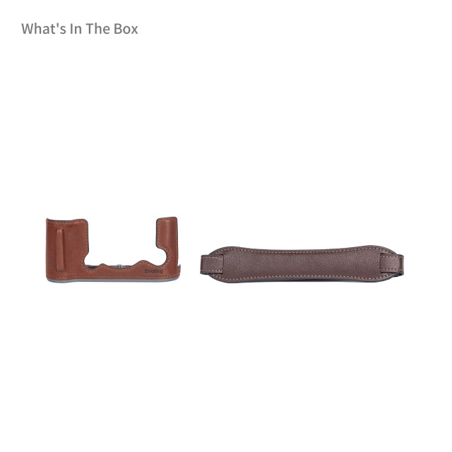 A SmallRig Leather Half Case Kit for FUJIFILM X-T50 (Brown) 4710 bőr fél tok készletet úgy tervezték, hogy védje a fényképezőgépet, miközben kiemeli annak vintage báját és minőségét. A készlet egy bőr féltáskát és egy vállpántot tartalmaz. Beépített habszivacs markolat a megnövelt ujjfogási erő érdekében. A féltáska tartós és légáteresztő, felső szemcsés bőr anyaga gazdagítja a fényképezőgép retro esztétikáját és tapintását, míg a velúrbélés védelmet nyújt a karcolások ellen. A beépített 1/4"-20-as hüvelykujjcsavarral az alján a tok közvetlenül a fényképezőgéphez rögzíthető, külön szerszámok nélkül. A tok akadálytalan hozzáférést biztosít a fényképezőgép legfontosabb funkcióihoz, például az akkumulátortartóhoz, a fókuszálási módhoz, a kártyafoglalathoz stb. Az integrált, űrtechnikai minőségű alumíniumkeret biztosítja a szoros illeszkedést és az ütésvédelmet. Az alján 1/4"-20-as menetes furat található, amely lehetővé teszi a közvetlen állványrögzítést a fél tok eltávolítása nélkül. Ezenkívül egy puha és kényelmes PU vállpántot is tartalmaz a könnyű hordozás érdekében.