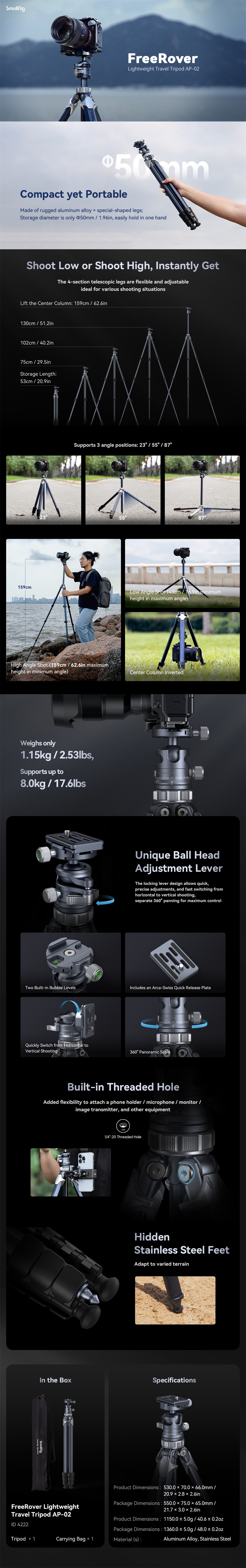 A SmallRig könnyű utazóállvány AP-02 4222 egy kompakt alumíniumötvözetből készült állvány, amelyet kifejezetten fényképezéshez terveztek. Nem kör alakú lábcsöveket és nem kör alakú középső oszlop kialakítást alkalmaz a maximális tömörség és helytakarékosság érdekében, valamint fenntartja a maximális stabilitást. A felső 1/4"-20 és 3/8"-16-os csavar támogatja a különböző folyadékfejeket a forgatáshoz és a videókészítéshez; a lábcsuklókban lévő három 1/4"-20-as menetes furat pedig lehetővé teszi a Magic Arm 3238 és 2115C mikrofon, monitor, képátviteli rendszer stb. rögzítését. A szilikon lábpárnák rejtett tüskés lábakkal rendelkeznek, amelyek megfelelnek a változatos, összetett terepviszonyoknak, és a szilikon lábpárnák eltávolítása után is használhatók.