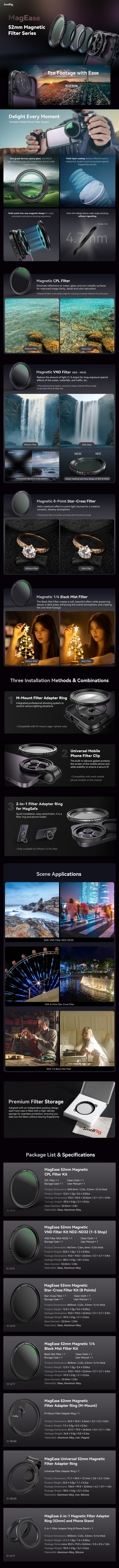 A német Schott B270i HD üvegből készült szűrő vízálló, foltálló, penészálló és karcálló AR-bevonattal rendelkezik, kevesebb színtévesztéssel, valamint CNC megmunkált, ultravékony kerettel. Nincs vignettálás még ultraszéles látószögű objektívvel történő felvételeknél sem. Mágnesesen és biztonságosan rögzíthető a SmallRig mágneses szűrőadapter-gyűrűhöz.