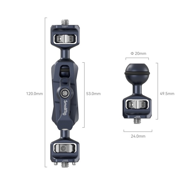 A SmallRig Magic Arm for Sony FX6 / FS5 / FS5 II 4123 a Sony FX6 / FS5 / FS5 II bővíthetőségének maximalizálására szolgál, hogy monitor, vezeték nélküli adó és egyéb tartozékok csatlakoztathatók legyenek hozzá. A gömbfej mindkét végén 1/4"-20-as csavarok vannak, az egyik végén nyúlékony csapokkal, a másik végén pedig pozicionáló csapokkal, hogy megakadályozza az elhajlást az eszköz rögzítése közben. Az állítható hüvelykujjkar segít megfelelő szögben rögzíteni a gömbfejet, és az alján egy kis mágneses kulcsot is tartalmaz a hüvelykujjkerék meghúzásához. A gömbfejrögzítő mindkét végén bevágások találhatók, amelyek több helyet hagynak a gömbfejek, valamint a rájuk szerelt tartozékok rugalmas beállításához. Ez az elem mindössze 88 g súlyú, így könnyen hordozható és tárolható.