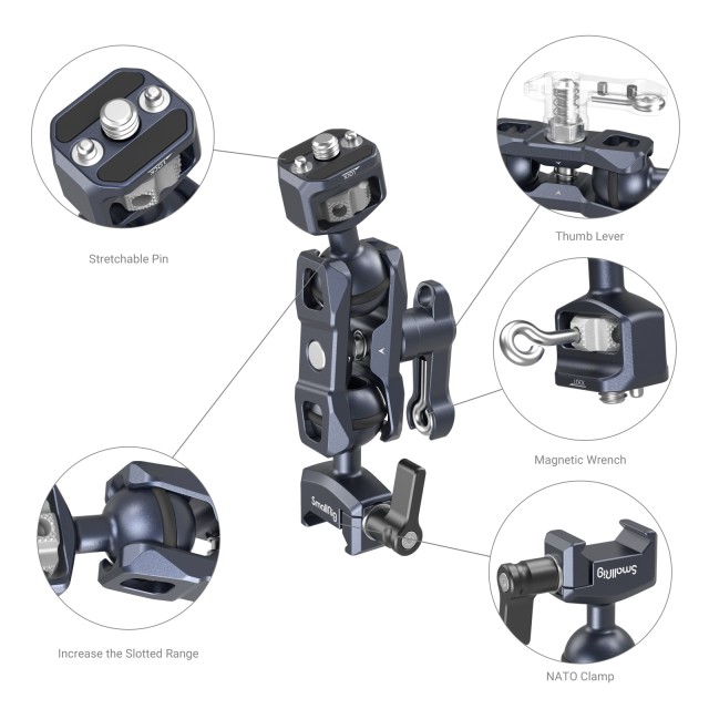 ASmallRig Magic Arm kettősgömbfejjel (1/4"-20 csavar és NATO bilincs) 3875 kompakt és könnyű. Mindkét gömbfej 20 mm átmérőjű, amelyek közül az egyik 1/4"-20-as csavarral és nyúlékony csapokkal rendelkezik, amelyek megakadályozzák a csavarodást, a másik pedig NATO bilinccsel rendelkezik, amely NATO sínnel támogatja a ketrecet, a felső lemezt stb. Az állítható hüvelykujjas kar segít a gömbfej megfelelő szögben történő rögzítésében, és egy kis mágneskulccsal rendelkezik az alján a hüvelykujjasok meghúzásához. A gömbfejrögzítő mindkét végén bevágások vannak, amelyek több helyet hagynak a gömbfejek, valamint a rájuk szerelt tartozékok rugalmas beállításához. Ez az elem mindössze 91 g súlyú, így könnyen hordozható és tárolható.