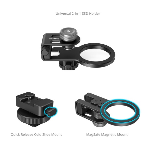 A SmallRig MagSafe / Cold Shoe univerzális 2 az 1-ben SSD tartó 4779 az USB-C külső merevlemezek csatlakoztatására szolgál okostelefonos fényképezés során. Kompatibilis a 8,0 - 16,0 mm / vastag SSD-kkel, elsősorban a Samsung T7, Samsung T7 Shield és Samsung T9 modellekkel. A bilincs egy becsúsztatható hidegcipő rögzítővel rendelkezik, amely gyorsan felszerelhető a bilincs aljára, így lehetővé teszi a különböző eszközökhöz való csatlakoztatást. A hidegcipő rögzítőelemet eltávolíthatja a MagSafe mágneses rögzítéshez a kívánt helyeken, például laptopokhoz vagy MagSafe-vel ellátott iPhone-okhoz. Mindkét telepítési módszer egyszerű és gyors, megkönnyítve a zökkenőmentes átmenetet a használati forgatókönyvek között. Emellett a bilincs szilikon párnázással rendelkezik, hogy megakadályozza az SSD karcolódását. Az alján található kábelbilincs egy hüvelykujjcsavarral rögzíti az USB-C kábelt a kényelmes és stabil adatátvitel érdekében. Ezenkívül egy fémgyűrűs matricát is tartalmaz a sokoldalú használathoz különböző beállításokban.