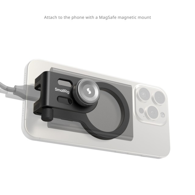 A SmallRig MagSafe / Cold Shoe univerzális 2 az 1-ben SSD tartó 4779 az USB-C külső merevlemezek csatlakoztatására szolgál okostelefonos fényképezés során. Kompatibilis a 8,0 - 16,0 mm / vastag SSD-kkel, elsősorban a Samsung T7, Samsung T7 Shield és Samsung T9 modellekkel. A bilincs egy becsúsztatható hidegcipő rögzítővel rendelkezik, amely gyorsan felszerelhető a bilincs aljára, így lehetővé teszi a különböző eszközökhöz való rögzítést. A hidegcipő-csatlakozót eltávolíthatja a MagSafe mágneses rögzítéshez a kívánt helyeken, például laptopokhoz vagy MagSafe-vel ellátott iPhone-okhoz. Mindkét telepítési módszer egyszerű és gyors, megkönnyítve a zökkenőmentes átmenetet a használati forgatókönyvek között. Emellett a bilincs szilikon párnázással rendelkezik, hogy megakadályozza az SSD karcolódását. Az alján található kábelbilincs egy hüvelykujjcsavarral rögzíti az USB-C kábelt a kényelmes és stabil adatátvitel érdekében. Emellett egy fémgyűrűs matricát is tartalmaz a sokoldalú használathoz különböző beállításoknál.