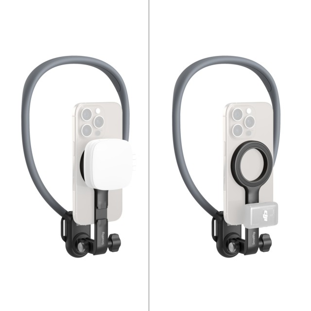 A nyakpánt univerzális 2-tüskés tartóval rendelkezik akciókamerákhoz, valamint mágneses telefontartóval az iPhone azonnali rögzítéséhez. A telefontartó 17 erős N52 mágnessel van felszerelve a biztonságos tartás érdekében, valamint egy további mágneses adaptergyűrűvel az Android és a nem MagSafe készülékekhez. Ha nem okostelefonoknál van használatban, a nyakrögzítő közvetlenül akciókamerákhoz is csatlakoztatható.