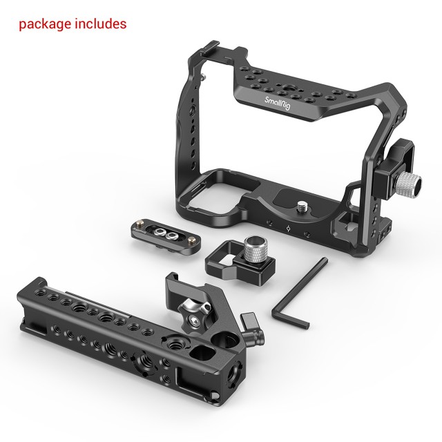 A SmallRig Master Kit for Sony Alpha 7S III A7S III A7S3 3009 tartalmaz egy alumínium teljes cage-et HDMI kábelbilincset, NATO vékony sínt és NATO gyorskioldó kapcsolóval ellátott felső markolatot. Többféle 1/4"-20 és 3/8"-16-os rögzítőmenettel, NATO-sínnel, vakusínes rögzítéssel és ARRI stílusú tartozékrögzítővel rendelkezik. A HDMI bilincs egy 1/4"-20-as csavarral és két elfordulásgátló csap segítségével rögzíthető, megakadályozva a kamera HDMI-kábelének véletlenszerű kihúzását. A NATO-sín két 1/4"-20-as csavarral rögzíthető a cage tetejéhez, a felső marakolat pedig gyorsan a sínhez csatlakozik, hogy kényelmes fogást biztosítson.