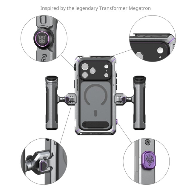 A SmallRig Dual Handheld Video Kit for iPhone 17 Pro (Megatron Edition) 5584 egy professzionális, kifejezetten az iPhone 17 Pro Max számára tervezett kézi felvételi megoldás, amely professzionális szintű videofelvételek, élő közvetítések és rövidfilmek készítését teszi lehetővé. Ez az átfogó készlet tartalmaz egy telefonhüvelyt, videokeretet, forgatható vezeték nélküli vezérlő oldalsó fogantyút, forgatható oldalsó fogantyút, TPU puha ütközőt és 2 darab háttérlemezt külső objektívekhez.
