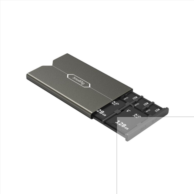 A SmallRig memóriakártya tok SD és Micro SD (TF) 2832B egy kiegészítő termék a fotózás szerelmeseinek. Három SD kártya és hat Micro SD kártya tárolására alkalmas, ami kényelmes a fényképezőgépek, akciókamerák és drónok memóriakártyáinak tárolására. Minden memóriakártya önálló biztonságos hellyel rendelkezik, amely gyorsan és biztonságosan becsúsztatható a kártyafoglalatba a tároláshoz. A kompatibilis kártyák nyomtatott nevével ellátott kártyahelyek a gyors azonosítást szolgálják. Kompakt és könnyen tárolható. A külső héj masszív alumíniumötvözetből, a belső tok pedig ABS+PC anyagból készült. Kihúzható szerkezetet használ a belső elemekhez való gyors hozzáférés megkönnyítése érdekében.