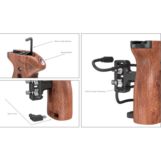 A 3323 SmallRig menetes oldalsó fogantyúja a távvezérlésű Record Start/Stop kioldóval úgy lett kialakítva, hogy kényelmes felvételi start/stop vezérlést biztosítson a stabil és kényelmes felvételkészítéshez. Az ergonomikusan kialakított, minden egyben fa fogantyú fokozza a tartás élményét. Biztonságosan rögzíthető két 1/4"-20-as menettel és állítható magassággal. A tetején 1/4"-20, 3/8"-16-os menetes furatok és a 2904 és 2905 monitortartóhoz való vakusín található; a tartozék csavarkulcs lehetővé teszi a tartozékok egyszerű eltávolítását és felszerelését. Három vezérlőkábellel van felszerelve, amelyek támogatják a Sony A7II/A7III/A6000/A6500, FUJIFILM X-T3/X-T4, Panasonic GH5/5S/G9/G95/S5/S1/S1R/S1/BGH1 és Z CAM E2/M4/S6 kamerákat. Adja hozzá a Sony fényképezőgépekhez való vállkészlethez a külön megvásárolható hosszabb vezérlőkábelt ID:3407.