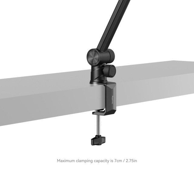 A SmallRig Microphone Boom Arm Desk Mount 4303 egy mikrofon karos mikrofonkar tartóból, egy hidegcipő tartóból, egy ⌀75mm / 2,9in teleszkópos rúdból, tíz kábelkötegelőből és két menetes adapterből áll, elsősorban podcast felvételhez, élő audio streaminghez, vlogoláshoz és más hasonló forgatókönyvekhez. A főtest alumíniumötvözet anyagból készült, amely 1,5 kg teherbírású, robusztus stabilitást biztosít, és megfelel a piacon elterjedt mikrofonrögzítési igényeknek. A ⌀75mm / 2,9 hüvelykes teleszkópos rúddal párosítva lehetővé teszi a legtöbb Canon mikrofon zökkenőmentes csatlakoztatását, kiküszöbölve a mikrofonkábelek és állványok okozta interferenciát.