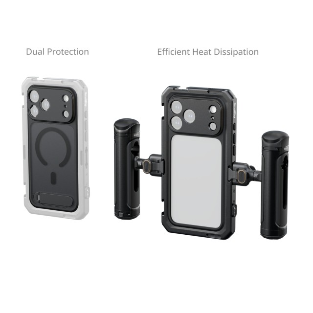 A SmallRig Mobile Dual Handheld Kit for iPhone 17 Pro Max 5541 egy professzionális, kifejezetten az iPhone 17 Pro Max számára tervezett kézi felvételi megoldás, amely professzionális szintű videofelvételek, élő közvetítések és rövidfilmek készítését teszi lehetővé. Ez az átfogó készlet tartalmaz egy telefonhüvelyt, videokeretet, forgatható vezeték nélküli vezérlő oldalsó fogantyút, forgatható oldalsó fogantyút és TPU puha ütközőt.