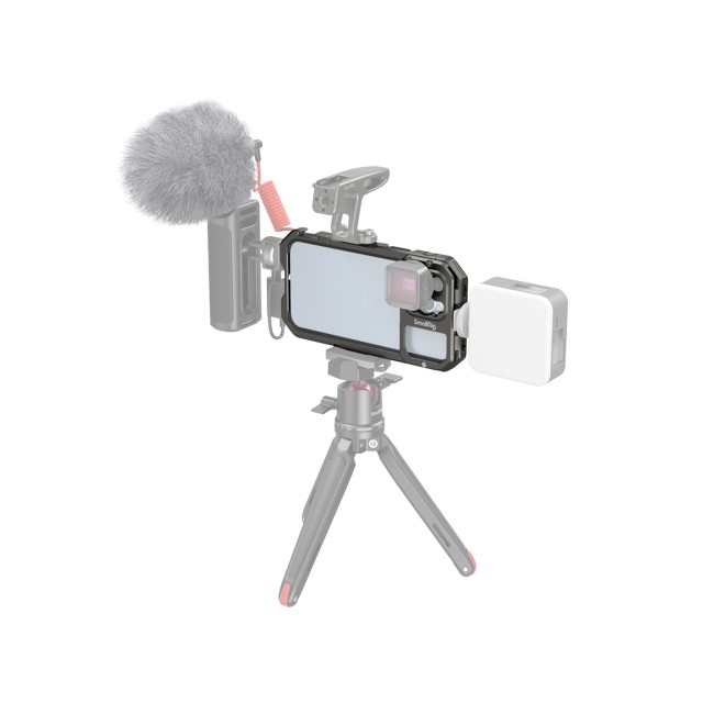 A SmallRig Mobile Video Cage 3561 egy többfunkciós, iPhone 13 Pro Max készülékhez, professzionális videózáshoz, élő közvetítéshez és vlogoláshoz tervezett cage. A kompakt, formabontó cage tömege mindössze 95 g, és 1/4"-20 menetes furatokkal és vakusínnel rendelkezik, amelyek olyan tartozékokat támogatnak, mint az 2424-es oldalsó markolat, a BUT2664-es mini tripod, a 3452-es mikrofon és a 3286-os LED lámpa. Hátsó objektívfedele cserélhető és kompatibilis az M-bajonettes vagy 17 mm-es menetes objektívekkel a jobb képminőség érdekében. Az kialakítás nem blokkolja az iPhone gombjait, portjait, az ultraszéles látószögű objektívek és a vezeték nélküli töltés használatát. A gyorszáras kialakítással könnyebben összeszerelhető és szétszerelhető, biztonságosabb és stabilabb, nem pattan ki véletlen érintés miatt, miután lezárta. A fémből készült full cage az integrált betétekkel védi az telefont, és megakadályozza az esetleges rezgéseket vagy karcolásokat. A cage egyaránt lehetővé teszi a vízszintes és függőleges felvételkészítést.