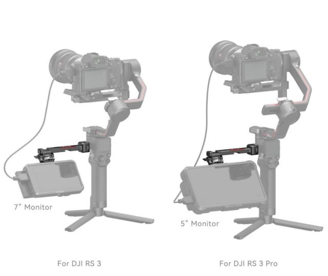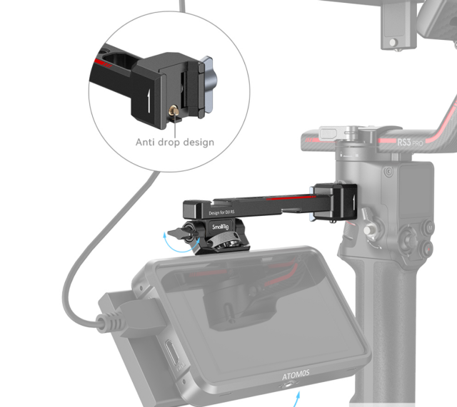SmallRig monitor tartó a DJI RS 2 / RSC 2 / RS 3 / RS 3 Pro / RS 3 Mini 3026B a DJI RS 2 / RSC 2 / RS 3 / RS 3 / RS 3 Pro / RS 3 Mini kardánokhoz készült, extra tartozékok, mint például monitor, LED videólámpa, hangvevő, képátvivő, akciókamera stb. felszerelésére. Gyorsan rögzíti a gimbal mindkét oldalát a NATO bilincs segítségével, amely a nagyobb biztonság érdekében leesésgátló kialakítással rendelkezik, a hüvelykujjas gombbal pedig a monitor 170°-ig dönthető. Több tartozék rögzítési pont van, beleértve két 1/4''-20-as furatot a tetején a Magic Arm 3238 akciókamerához vagy képátadóhoz, valamint egy hidegcipő rögzítést a tetején és az alján a hangvevő, mikrofon, LED-videólámpa stb. számára. Egy másik kiemelkedő elem a csavarodásgátló csap, amely segít a monitor további stabilizálásában. Összességében a 3026B, amely támogatja az 5" és 7" monitorokat, kompakt, és tökéletesen illeszkedik a DJI RS sorozatú kardánokhoz a dizájnstílus és a tartozékok rögzítése szempontjából.