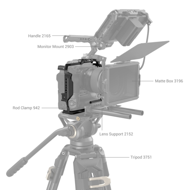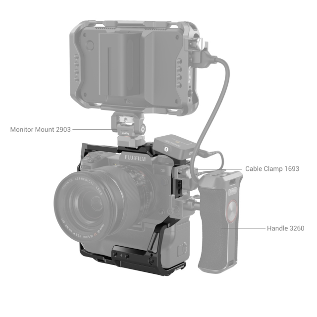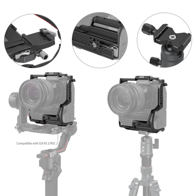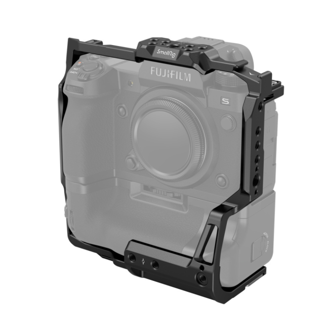 A SmallRig Multifunctional Cage for FUJIFILM X-H2S with FT-XH / VG-XH Battery Grip 3933-as cage-et úgy tervezték, hogy védje a fényképezőgépet és számos rögzítési pontot biztosítson. A kamerát egy 1/4''-20-as csavarral az alján és két oldalsó rögzítő adapterrel rögzíti, továbbá több gumipárnával is rendelkezik a karcolások megelőzésére. A cage teljes hozzáférést biztosít a gombokhoz, funkciókhoz, a kártyafoglalathoz, az akkumulátorfedélhez és a flip képernyőhöz. Rendelkezik 1/4"-20 és 3/8"-16-os menetes furatokkal a 2165-ös és 1638-as felső markolatok, a 2093-as oldalsó markolat, a 1693-as HDMI kábelrögzítővel a stabil adatátvitelhez, 2903-as és 2904-es monitortartóval a monitor rögzítéséhez, 2115-ös Magic Arm; két vakusínes rögzítővel mikrofonokhoz, LED lámpákhoz stb. Az alsó Arca-Swiss gyorskioldós kialakítás támogatja az Arca-Swiss állványt és a DJI RS 2/RSC 2-t a kézi, stabilizátoros és állványos felvételek közötti gyors váltáshoz. Az elülső részén két 1/4"-20-as menetes furat található, amelyek kompatibilisek a 15 mm-es RailBlock v3 942-vel - így olyan akár egy Matte Box 3196 és a Lens Support 2152; és egy 1/4"-20-as helymeghatározó furat, amely támogatja a Single Rod Clamp 3276-ot a Follow Focus 3010-hez. Emellett egy integrált laposfejű csavarhúzó is rendelkezésre áll az össze- és szétszerelés megkönnyítésére.