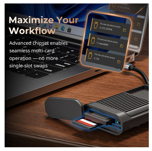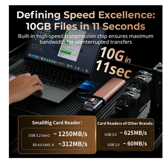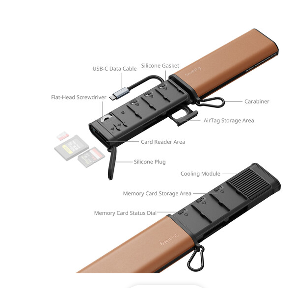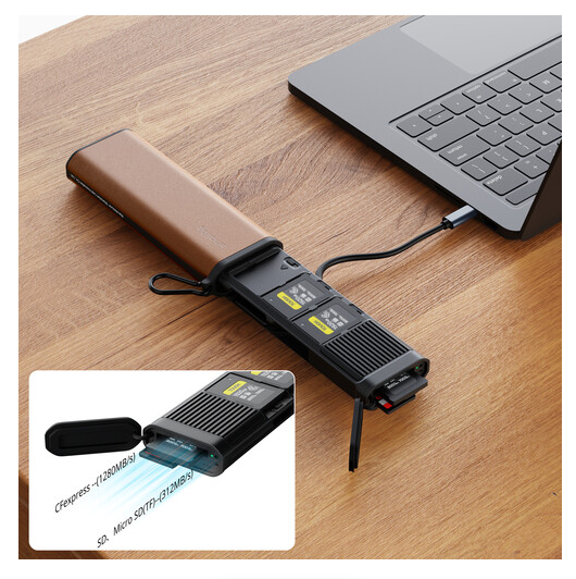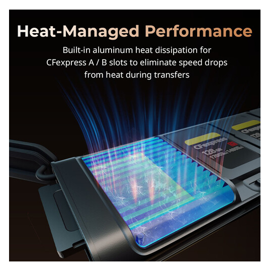 A PGYTECH CFexpress Type B multifunkcionális kártyaolvasó és tároló tok a professzionális fotósok és videósok számára a legjobb all-in-one megoldás, amely ultragyors adatátvitelt, robusztus kártyatárolást és intelligens kialakítást ötvöz egyetlen hordozható egységben. Egy CFexpress Type B nyílással (akár 1250 MB/s), egy UHS-II SDXC nyílással és egy UHS-II microSDXC nyílással felszerelve, intelligens sávszélesség-prioritizálással támogatja az egyidejű olvasási/írási műveleteket. Az integrált USB-C 3.2 Gen 2 kábel buszról táplált teljesítményt nyújt, és átjárható töltőporttal rendelkezik, hogy a laptopok vagy táblagépek átvitel közben is feltöltve maradjanak. A beépített alumínium hűtőbordák megakadályozzák a hőmérséklet-csökkentést, míg az IP54 besorolású ABS és alumínium burkolat ellenáll a pornak és a vízcseppeknek. A tok három CFexpress Type B, négy SD és két microSD kártyát tárol biztonságosan, kioldásgátló csatokkal, és egy integrált AirTag rekesz (az AirTag külön kapható) biztosítja a könnyű nyomon követhetőséget az Apple Find My hálózatán keresztül. További kiegészítő eszközök: lapos csavarkulcs és karabiner a biztonságos rögzítéshez. A -10 és 50 °C közötti hőmérsékleten megbízhatóan működő, 6,5 x 2,6 x 1,1 hüvelykes eszköz hatékonyságra, tartósságra és a terepen való nyugodt használatra lett tervezve.