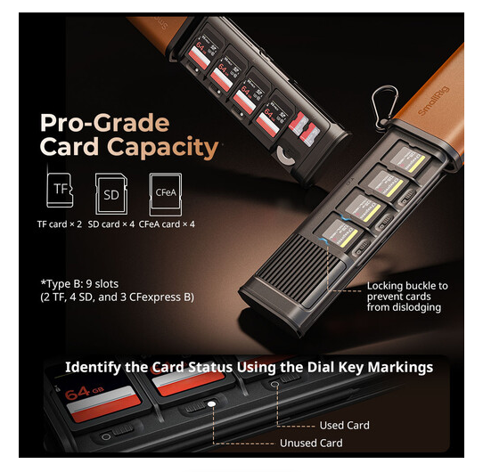 A PGYTECH CFexpress Type B multifunkcionális kártyaolvasó és tároló tok segítségével akár 1250 MB/s-os villámgyors adatátvitelt és akár kilenc memóriakártya biztonságos tárolását biztosíthatja. A tok egyidejűleg UHS-II SD/microSD és CFexpress Type B kártyahelyekkel, integrált USB-C 3.2 Gen 2 kábellel átfolyó töltéssel, hőstabilitást biztosító alumínium hűtőbordával, IP54 por- és vízálló, AirTag nyílással a nyomon követéshez, valamint strapabíró ABS/alumínium kivitelben – mindez egy kompakt, 235 grammos csomagban.