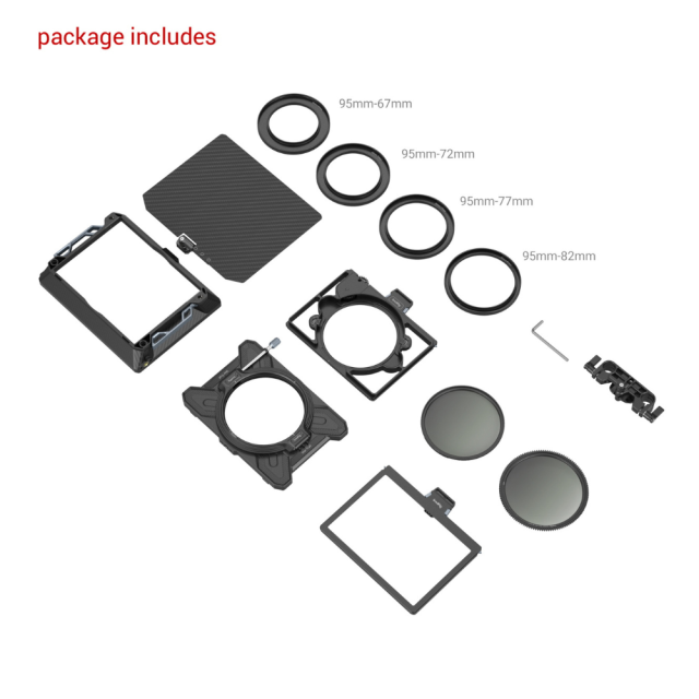 A SmallRig multifunkcionális moduláris matt doboz (Φ95 mm) VND Kit 3645, mint a Star-Trail sorozat egyik matt doboza, tükör nélküli fényképezőgépekhez készült, hogy megakadályozza a napfény vagy más fény által okozott tükröződéseket és visszaverődéseket, és szabályozza a képernyőn megjelenő képet. A adott DOF esetében segít kiegyensúlyozni az expozíciót a külső fényáramlás megváltoztatásával. A készlet alapkivitelben négy menetes adapterrel (Φ67-95 mm / Φ72-95 mm / Φ77-95 mm / Φ82-95 mm) kör alakú szűrőkhöz, mint például VND, GND, CPL, hagyományos digitális tükörreflexes objektívek és 35 mm-es objektívek Φ95 mm, vagy külön megvásárolhatja az adaptergyűrű-készletet (Φ52-95 mm / Φ55-95 mm / Φ58-95 mm / Φ62-95 mm / Φ86-95 mm) 3383 készletet a nagyobb kompatibilitás érdekében.