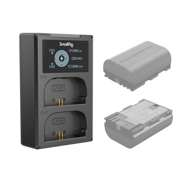 A SmallRig LP-E6NH fényképezőgép akkumulátor töltő 4084 kiváló minőségű ABS+PC tűzálló anyagból készült. A felület matt, magas hőmérsékletnek ellenálló, tapintható és tartós. A beépített akkumulátortartály mérete megegyezik az eredeti fényképezőgép akkumulátor méretével, szorosan illeszkedik a fényképezőgép akkumulátortartályához, és elakadás nélkül telepíthető. A töltő kettős nyílású kialakítást alkalmaz, amely egyszerre két akkumulátort tud tölteni. Az LCD-képernyő valós időben mutatja a töltési feszültséget, a töltési áramot és a töltési mennyiséget, így a felhasználók intuitívabban láthatják a töltési feszültséget, a töltési áramot és a mennyiséget. A töltő beépített USB-A töltővezetékkel és USB-C bemeneti porttal rendelkezik, amely bármilyen módon tölthető a töltőn, autós töltőn és mobil tápegységen keresztül.