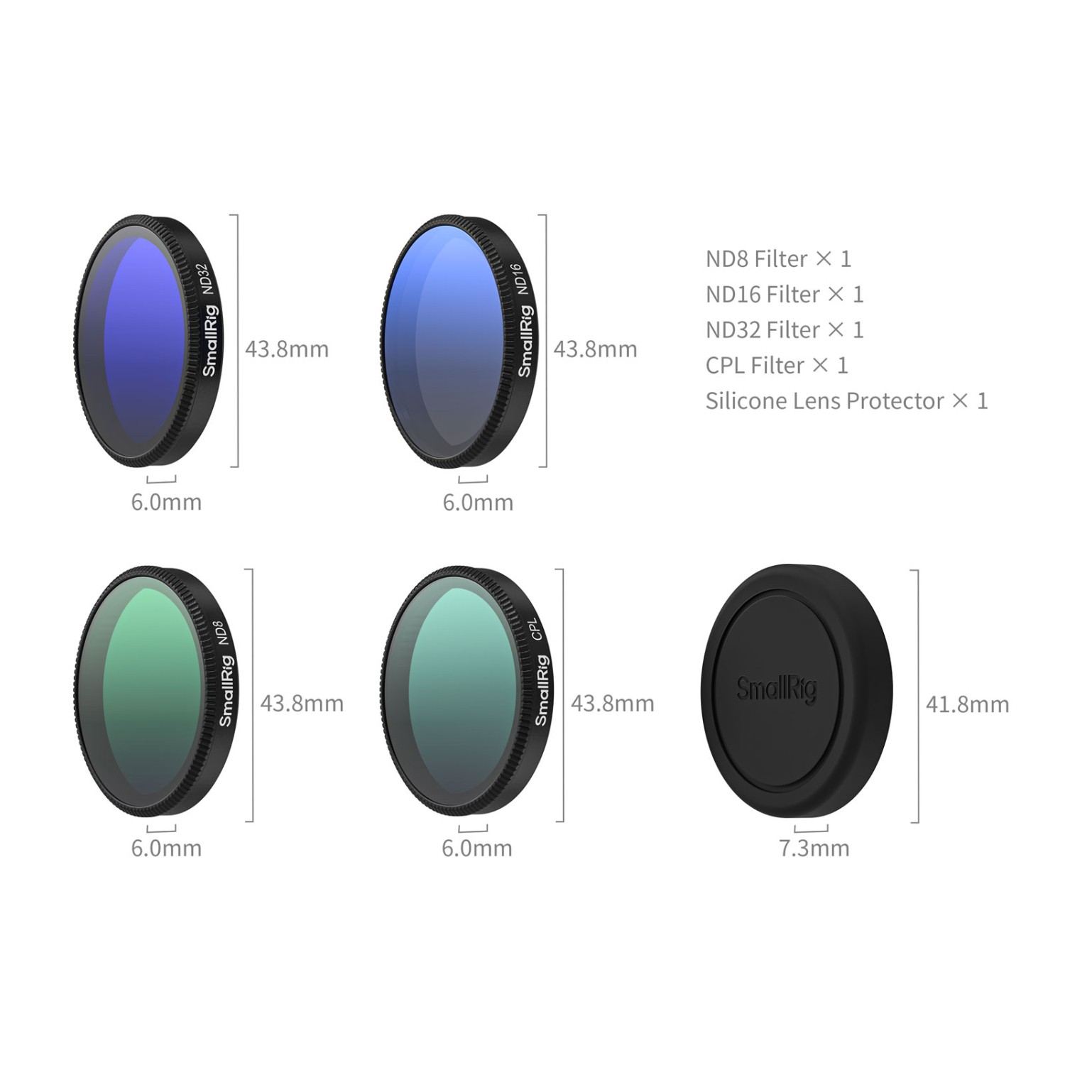 Az ND8 szűrő ideális erős napfényes körülményekhez, kiegyensúlyozott expozíciót biztosítva; az ND16 szűrő közepes fényviszonyokhoz lett tervezve, segítve a fényes és árnyékos részletek megőrzését; az ND32 szűrő erős fényviszonyokhoz vagy kreatív hosszú expozíciókhoz, például fénynyomok és mozgáselmosódás effektusokhoz alkalmas; a CPL szűrő pedig hatékonyan megszünteti a nem fémes felületekről, például vízről és üvegről származó nem kívánt tükröződéseket, miközben javítja a víz alatti és az ablakon keresztül történő láthatóságot.