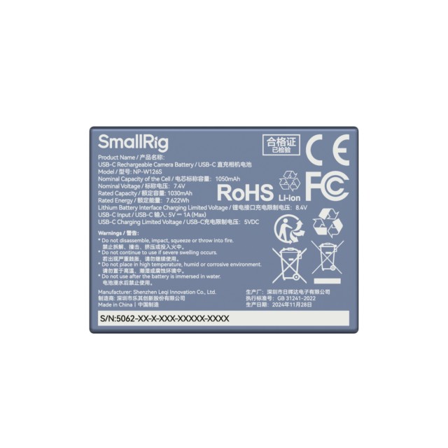 A SmallRig NP-W126S USB-C újratölthető fényképezőgép akkumulátor 5062 lehetővé teszi, hogy power bankon, hálózati szalaggal, autós töltőn vagy más speciális töltőn keresztül tölthető legyen. A nagy áramerősségű töltés (5V 1A) és az 1050mAh névleges kapacitás révén az akkumulátor 2,5 óra alatt megtölthető és hosszabb ideig üzemelhet. Teljesen dekódolt, felugró ablakok nélkül, ez a vizuálisan megkülönböztető akkumulátor matt ABS és PC burkolattal rendelkezik, amelyek tűzállóak és tartósak. Pontosan ugyanolyan méretű, mint az eredeti fényképezőgép-akkumulátor, ezért nem kell aggódnia, hogy elakad.
