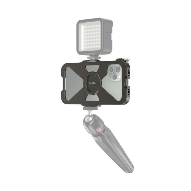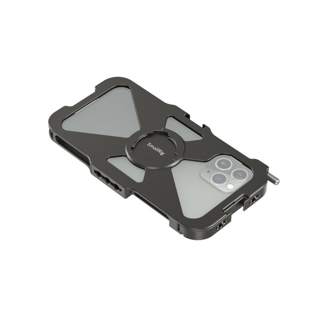 A SmallRig CPA2471-es iPhone 11 Pro mobiltelefon cage úgy lett kialakítva, hogy megvédje iPhone 11 Pro készülékét, és hozzáférést biztosítson más kiegészítők csatlakoztatásához mobil fotó- és videózáshoz, élő közvetítéshez, interjúkészítéshez, vlogoláshoz stb. Egyik oldalán hüvelykujjcsavarral rendelkezik, amely biztosítja a telefon gyors fel- és leszerelését. Két vakusaruval és több 1/4"-20-as menetes furattal rendelkezik, amelyek lehetővé teszik különböző tartozékok, például mikrofon, LED-lámpa, állvány stb. rögzítését, és támogatja a vízszintes és függőleges felvételkészítést is. Kompatibilis a SmallRig HSS2424 alumarkolattal, valamint a SmallRig BSC2390 kábelbilinccsel. A beépített gumi alátétek segítenek elnyelni az ütéseket és megakadályozzák a telefon karcolódását. A súlycsökkentést és a mobiltelefon hűtését szolgáló üreges kialakítás elkerüli az oldalsó gombokat és a kezelőfelületet, valamint az antenna területét, hogy elkerülje a jelzavarok kockázatát. Csuklópánthoz való furattal is rendelkezik.